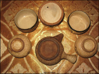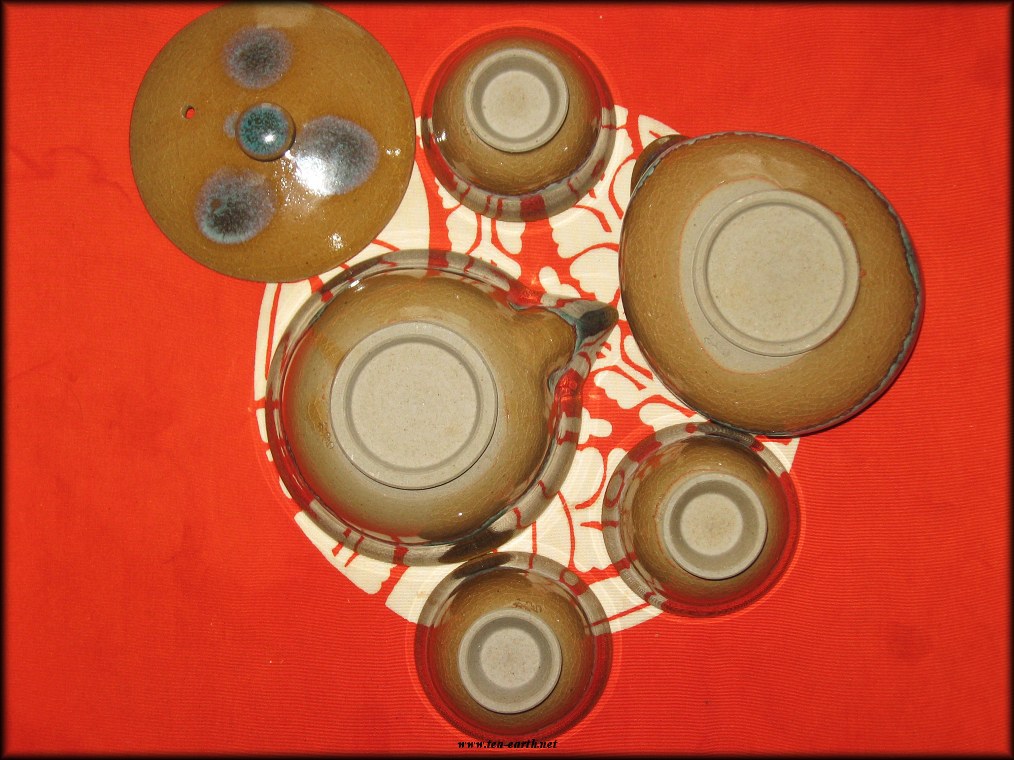 štětcem. Překrásná glazura s kropenatým vzorem zdobí tuto soupravu.