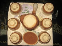 a pět šálků. Hrubá přírodní glazura a malované znaky dávají této soupravě svébytný vzhled. Autor: Zatím neznámý.